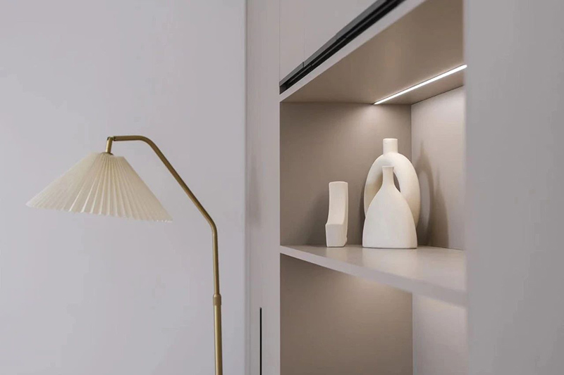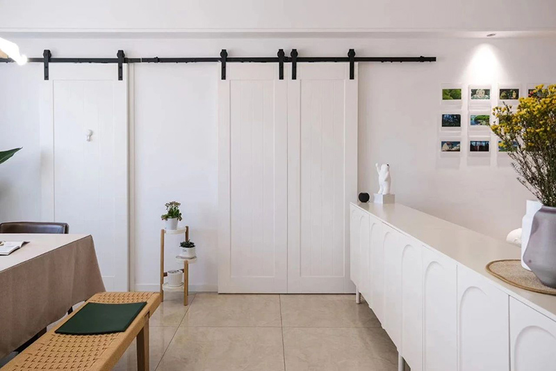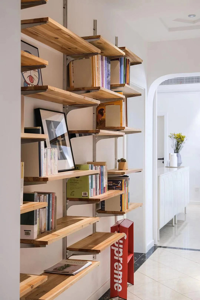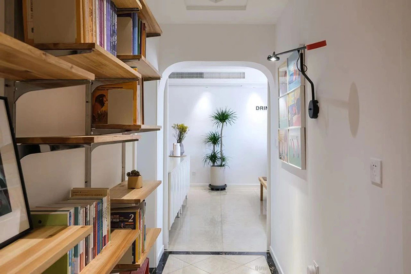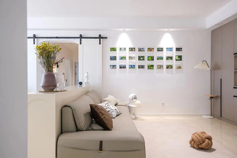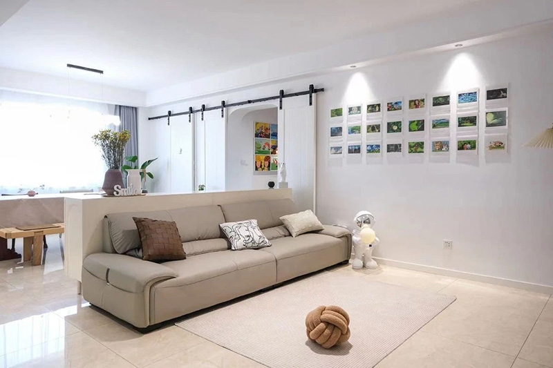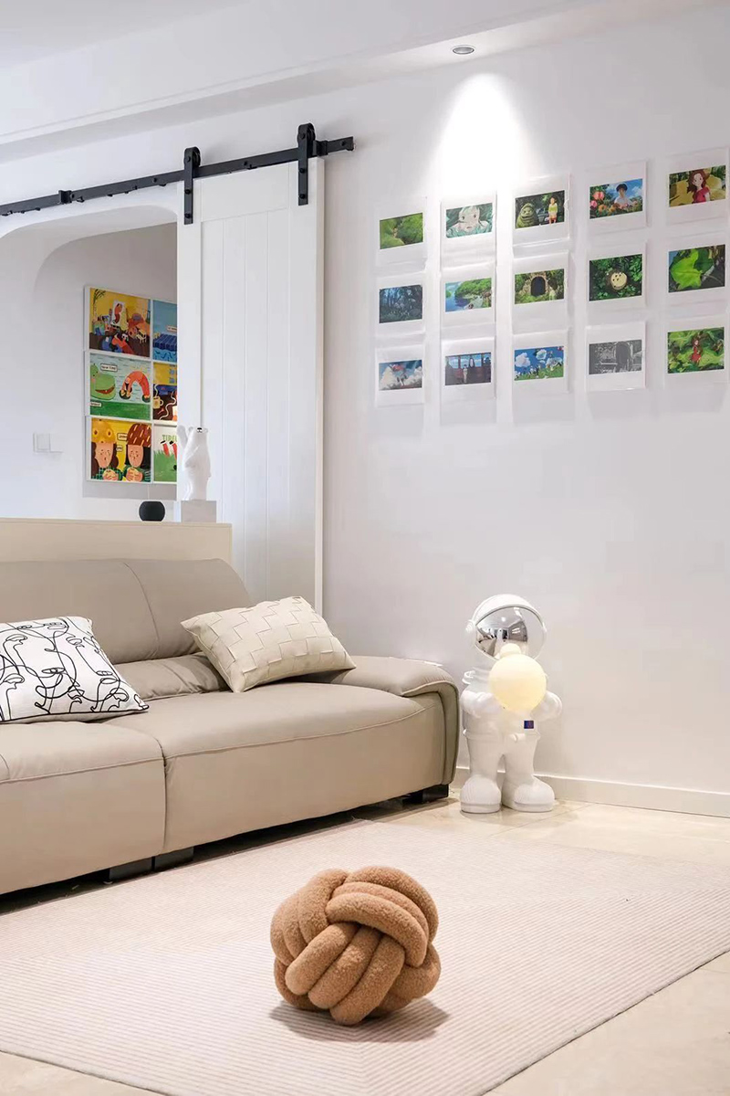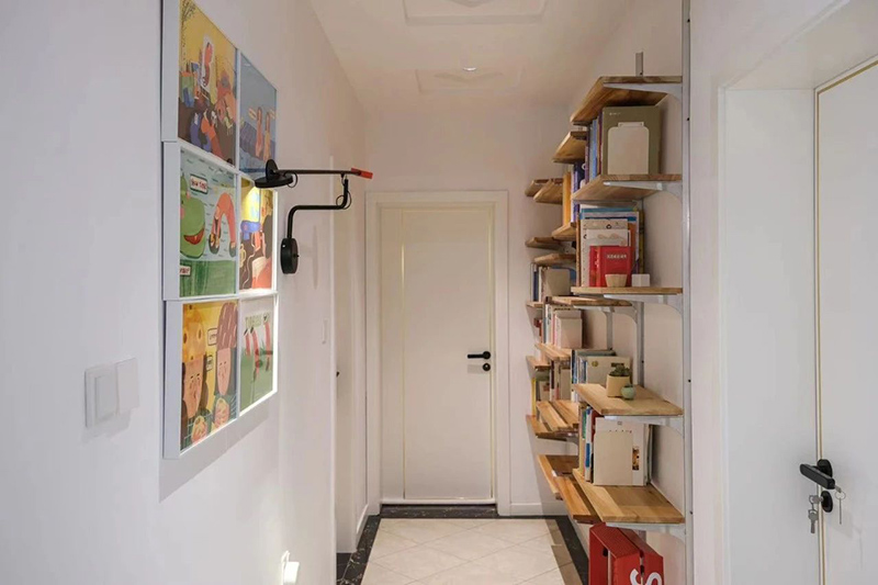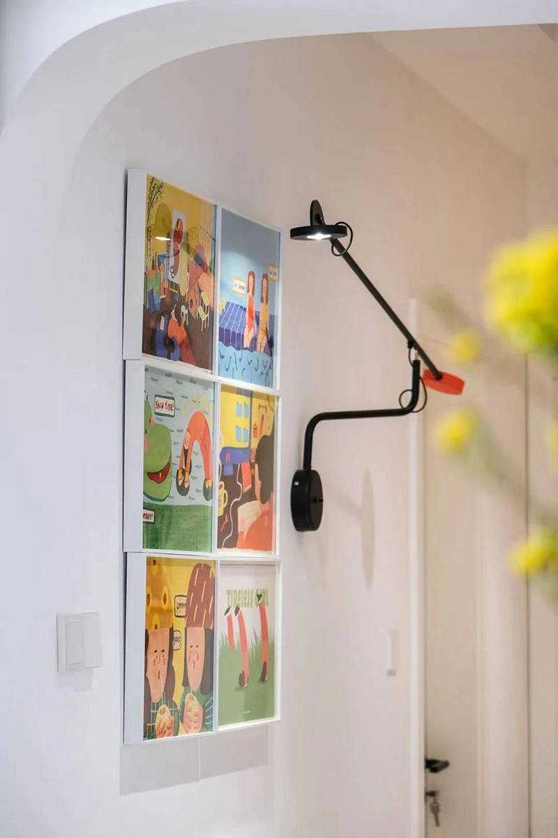 兴趣博物馆:美是基础,而功能才是空间中的高级表达。实用主义的思维已经渗透到每个角落,餐边矮柜与沙发依靠,形成和谐的完整收纳,建立了一个活跃的视觉联系,随着边上的谷仓门缓缓开启,灯光聚焦在一幅幅色彩鲜明的儿童画上与客厅侧边的琳琅满目的宫崎骏漫画墙进行了一种非常生动活泼的互动,酷似一个迷你博物馆,陈列着业主的兴趣、审美以及爱与回忆。