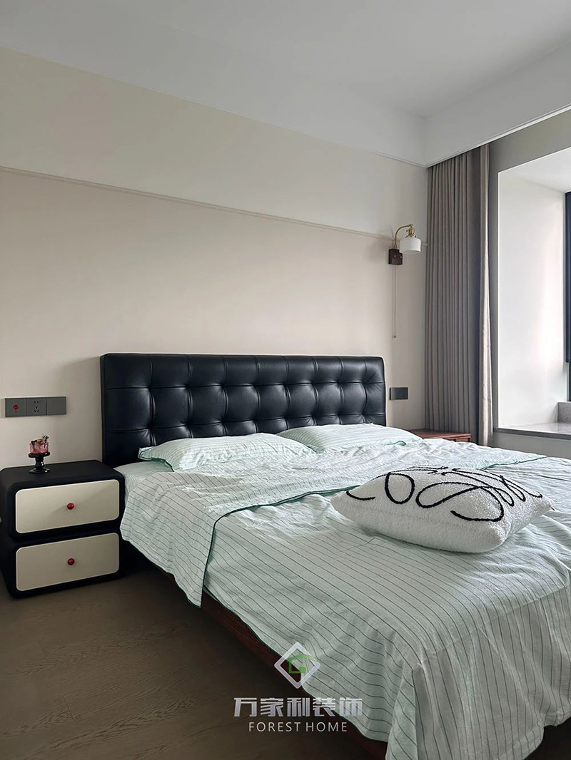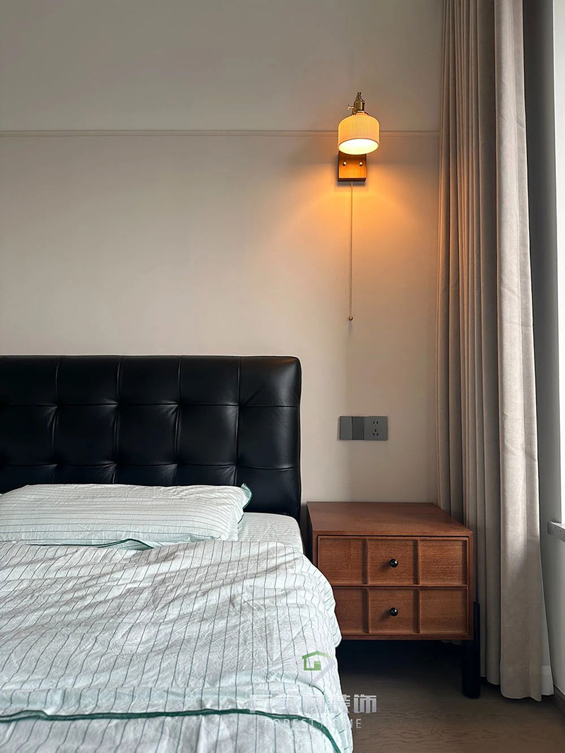 卧室床头悬挂着法式中古风的陶瓷壁灯,温暖的灯光散发出淡淡的怀旧氛围,手工陶瓷的质感与温润的色调,赋予了空间独特的艺术气息。
