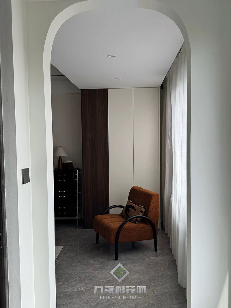 窗边的休闲角设计在追求美观的同时兼顾舒适感。一把栗棕色的雪尼尔彩虹椅,搭配弧度优美的扶手,为这个角落增添了柔和的触感。清晨的第一缕阳光洒进来时,这里成了享受生活、阅读、思考的完美空间,平静而温馨。