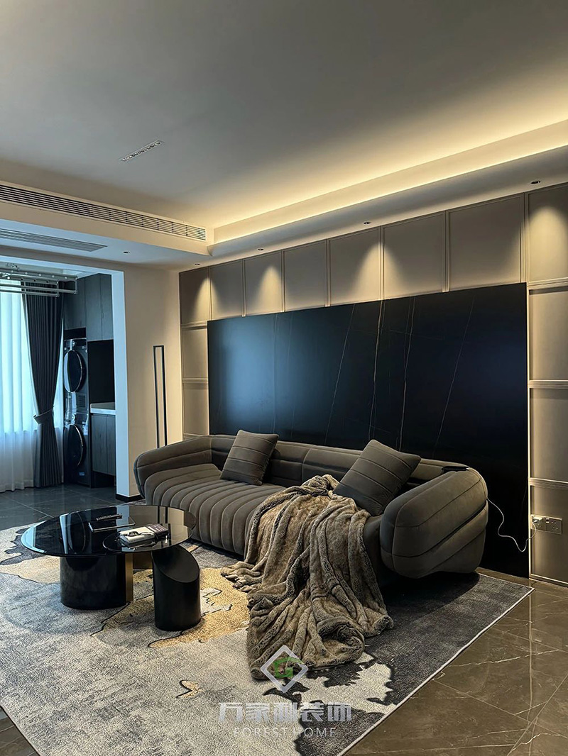 客厅选用了意大利香蕉布艺沙发,低调的色彩与舒适的质感完美结合,暗黑色调的背景与沙发柔和的线条形成强烈的对比,柔软与硬朗相融,营造出高级感。