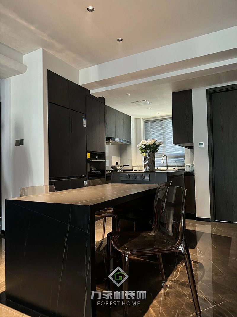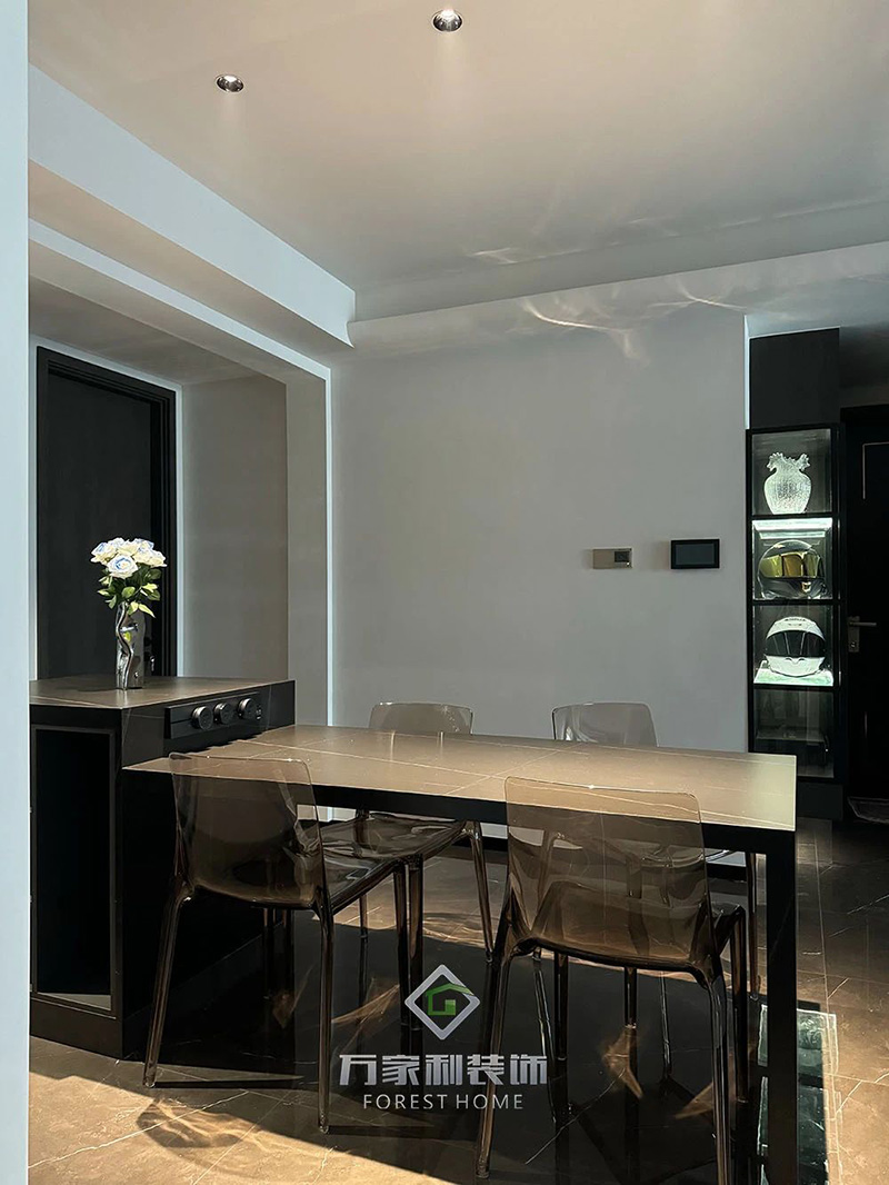 餐厅的透明亚克力餐椅为暗色空间增添轻盈感,简约设计中带有未来感,更让整个暗色调的空间显得不沉闷。