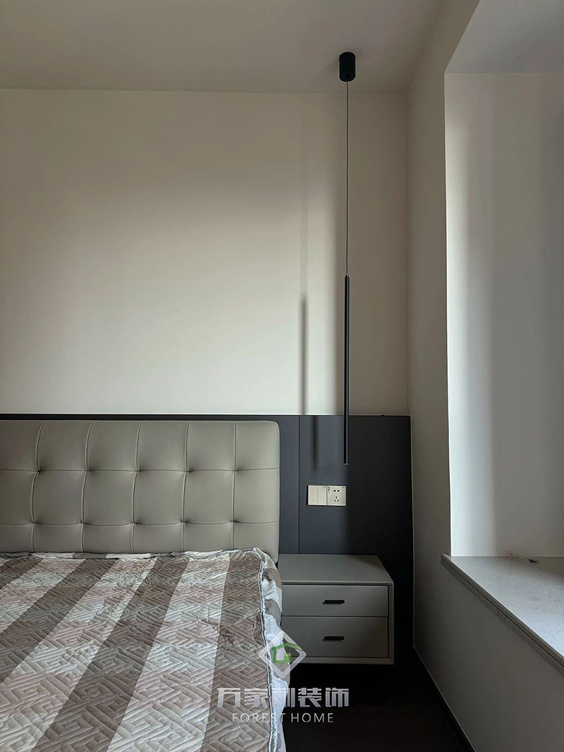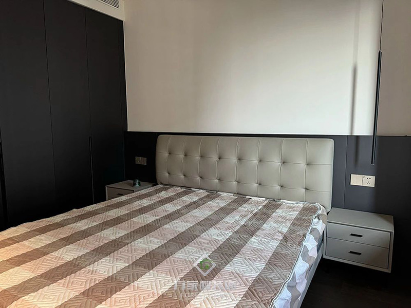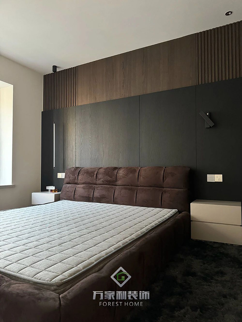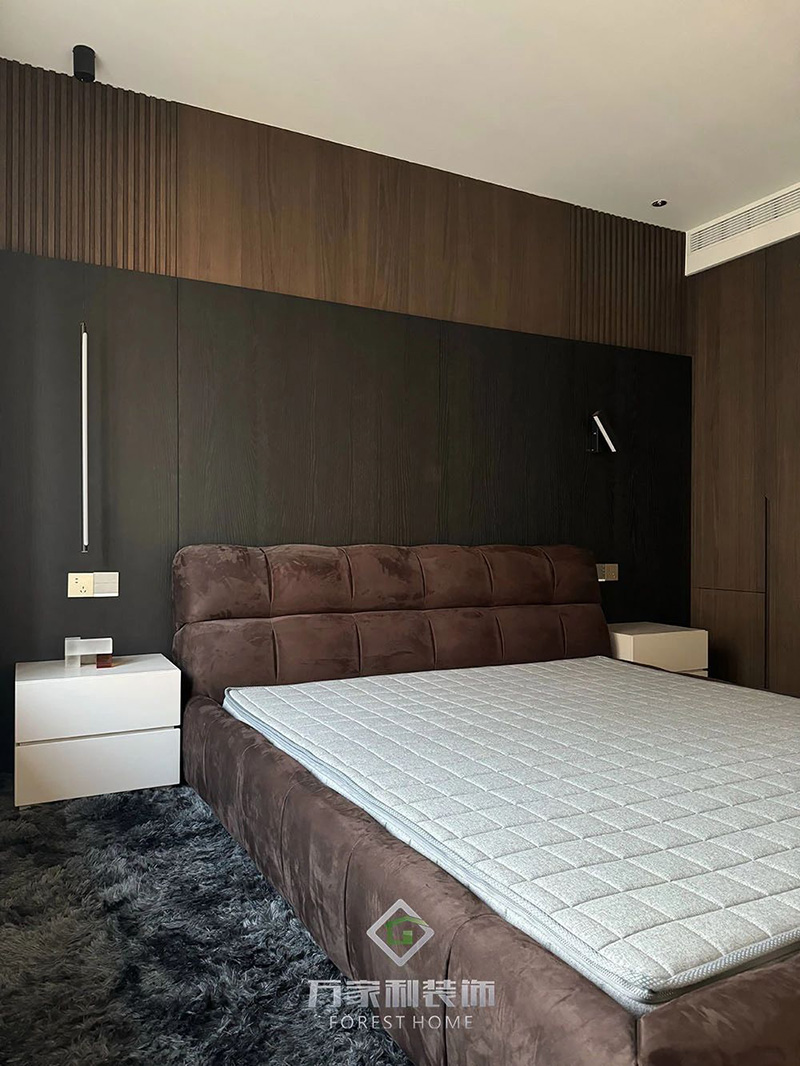 轻奢泡芙床与栗棕色木板背景墙:沉稳温暖的卧室氛围,带来极致放松体验,打造舒适的睡眠环境。