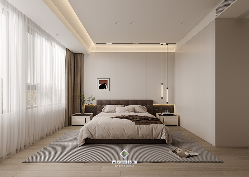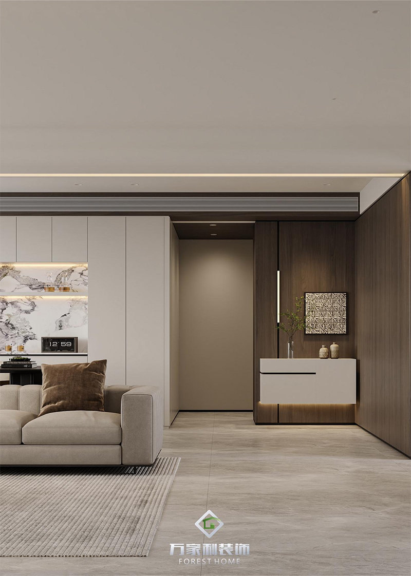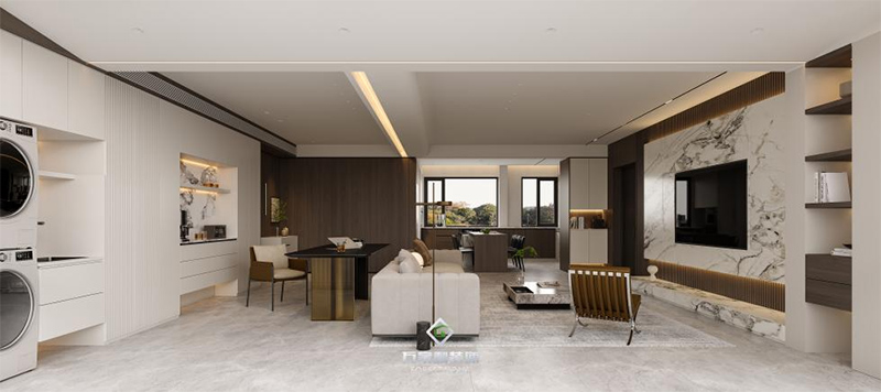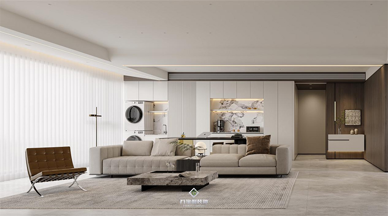 横厅布局,没有模板化的布局,以沙发为界,一半会客厅一半是书房,客厅功能也更为多元。