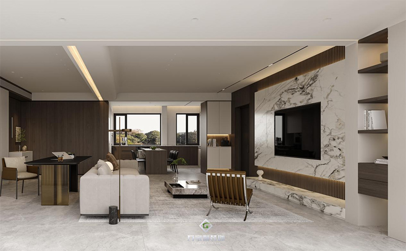 本案公区大面积采用整面大理石的墙上,为体现出空间的层次及造型上的融合。