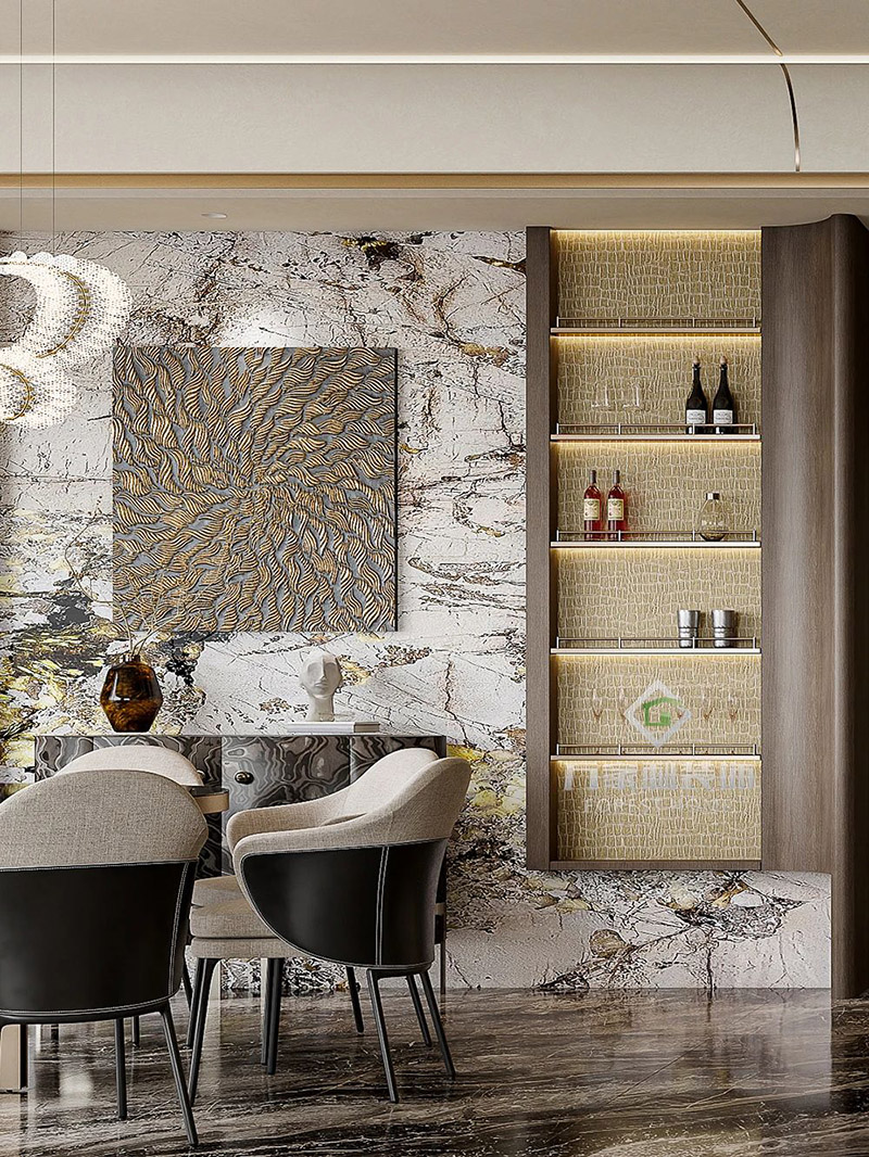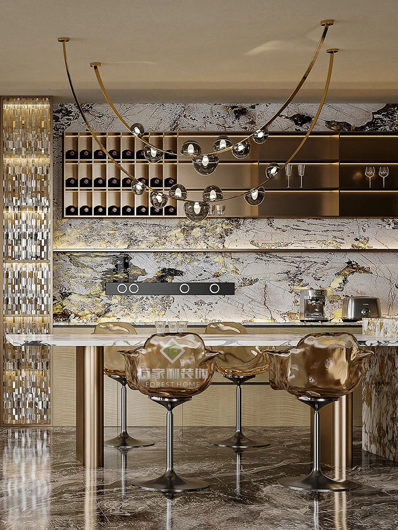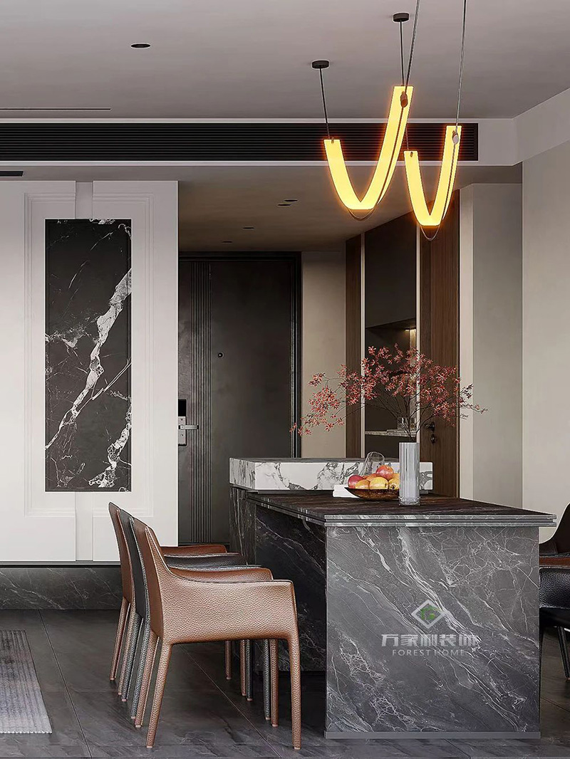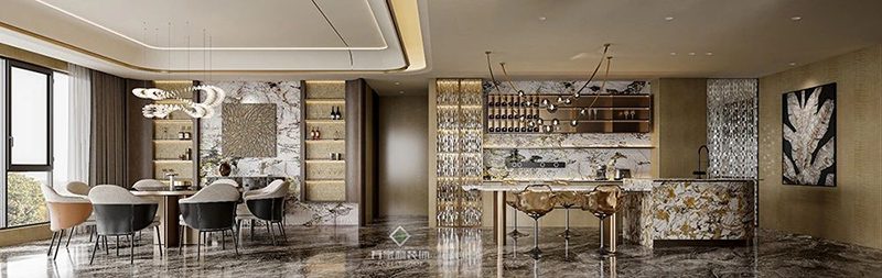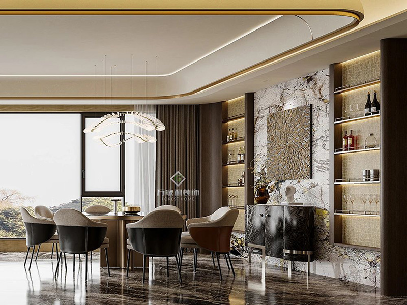 经典高奢质感与现代主义相结合,更注重空间的内敛的奢华和神秘。整体呈现空间的质感和层次感,内敛布高级,暖调灯光赋予空间沉稳气质,力求风格统一,彰显干净整洁而高级。