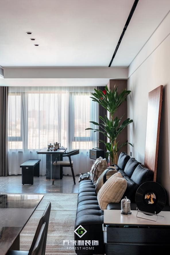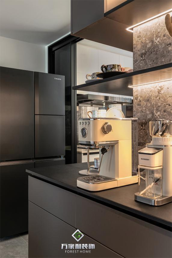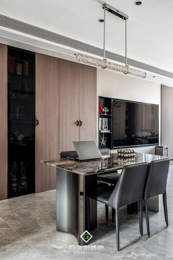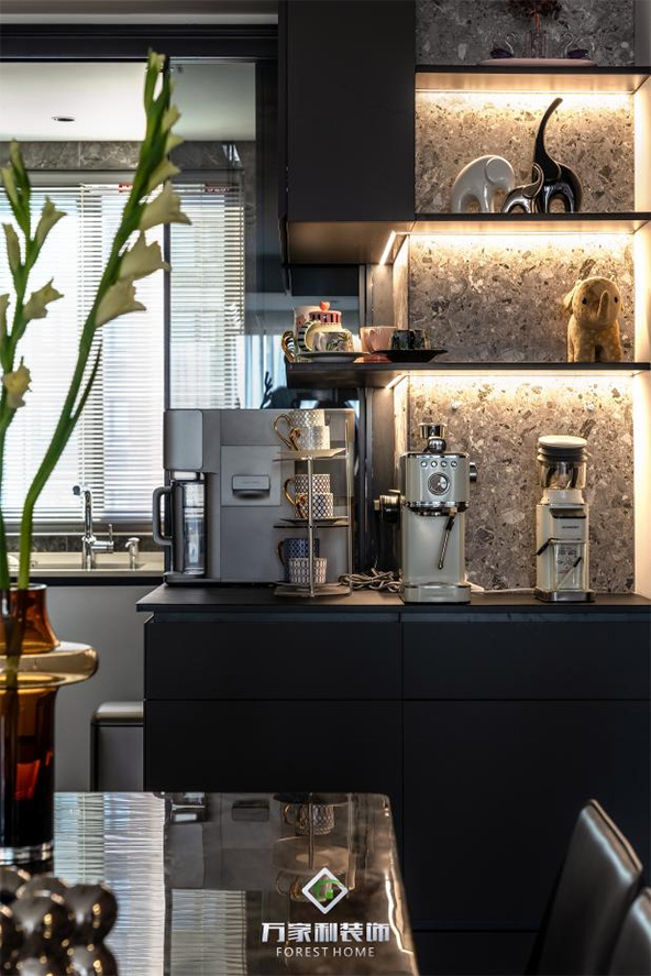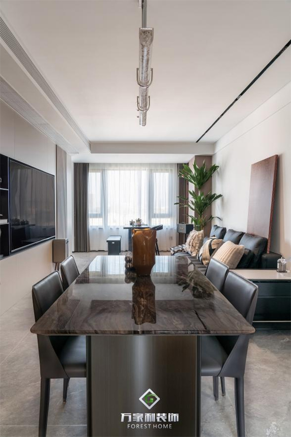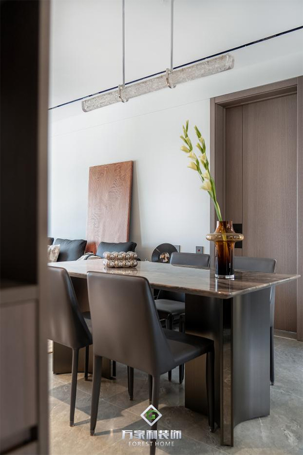 餐厅与客厅相连,开放式的布局让空间显得更加宽敞。黑色的餐桌搭配简约的餐椅,每一处都透露着意式的简约与时尚。上方独特的吊灯,就像夜空中闪烁的星星,为用餐时光增添了几分浪漫的氛围。