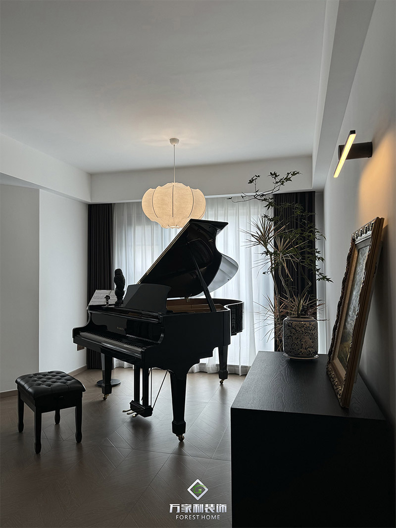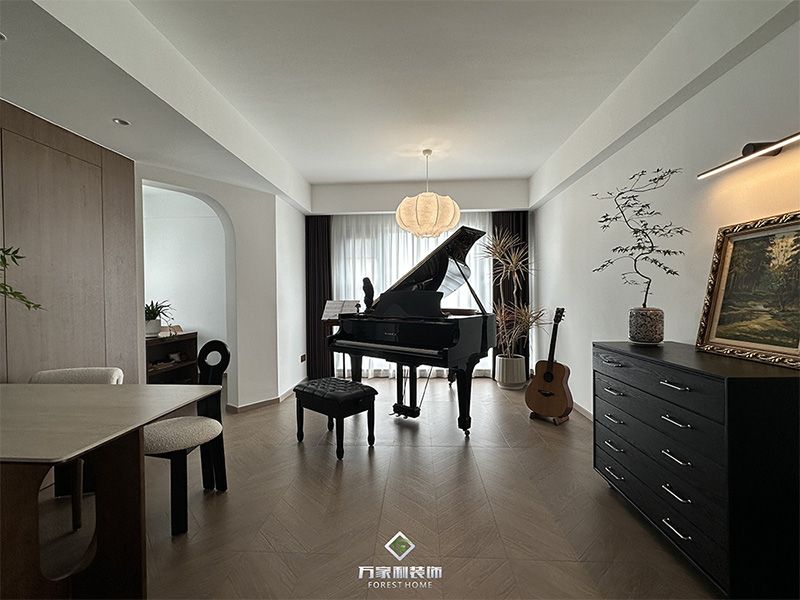 一进门,钢琴抢走客厅C位,艺术的气息蜂拥而至。错落有致的空间布局让人极度舒适,复古木质地板与现代简约线条的巧妙结合,既保留了复古的韵味,又不失现代感,空间内穿插一些绿植让空间有了“呼吸感”。